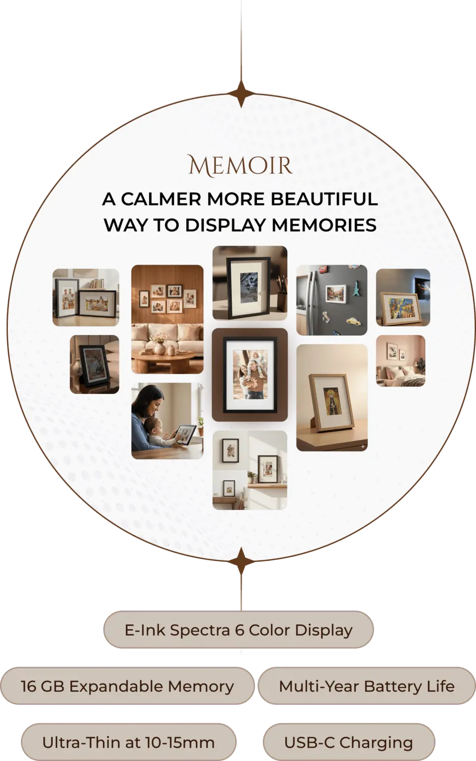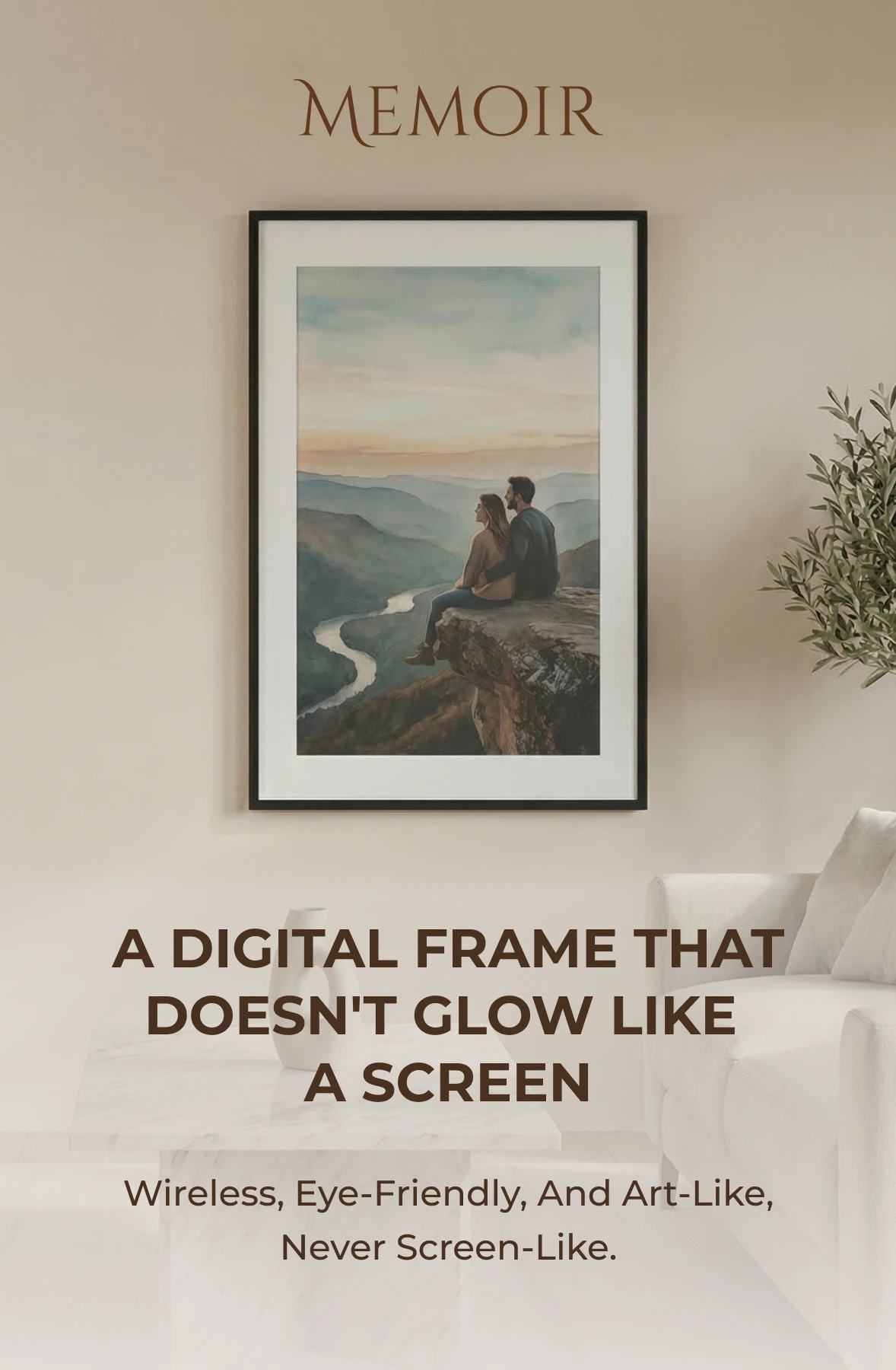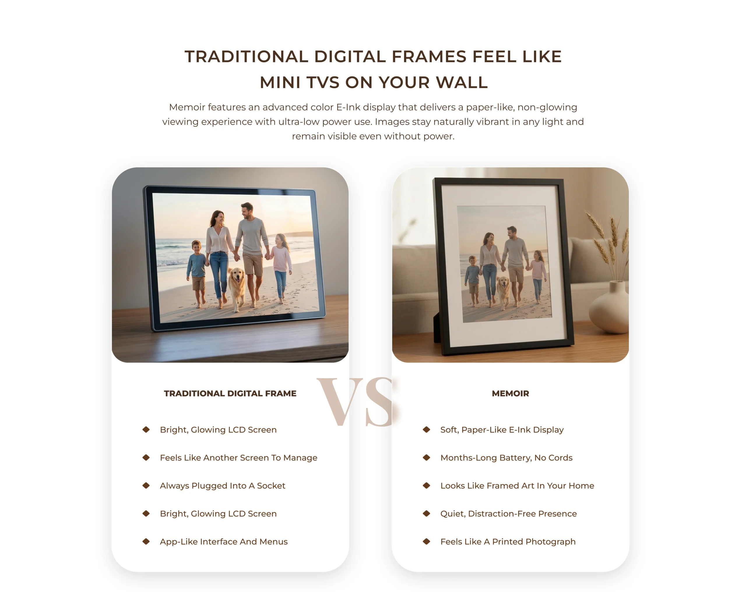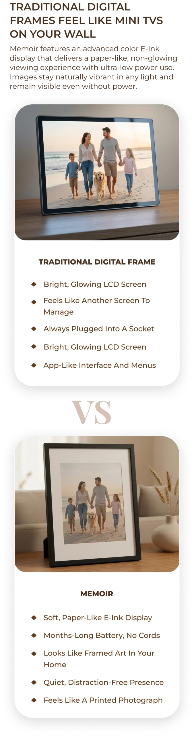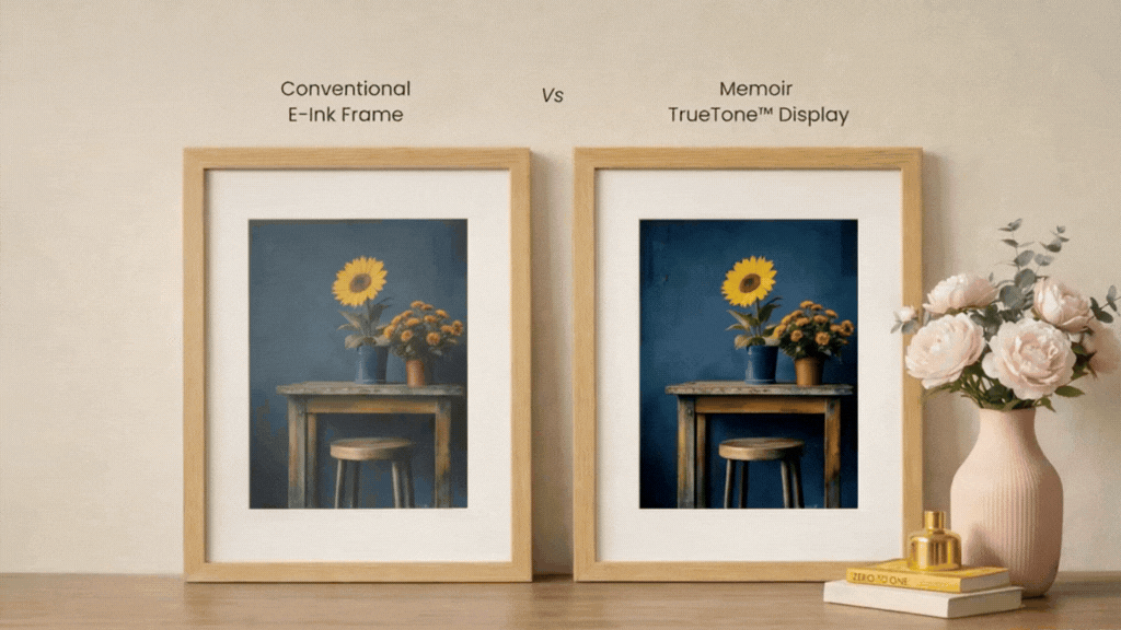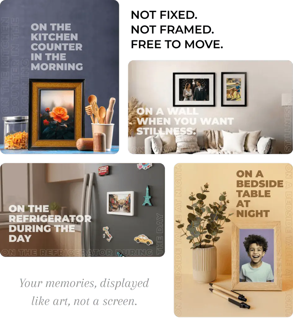 Neither. Memoir is a distraction-free E-Ink display designed only to show selected memories. It does not run apps, send notifications, or behave like a smart screen.