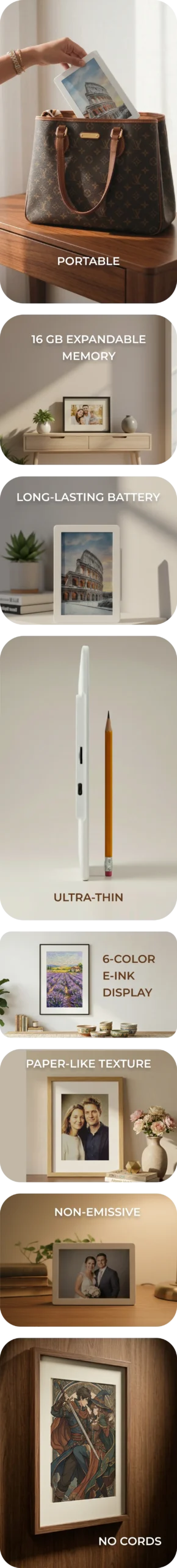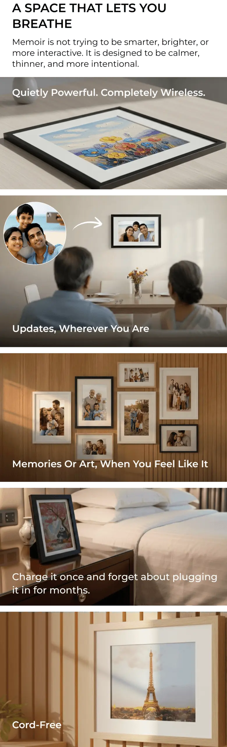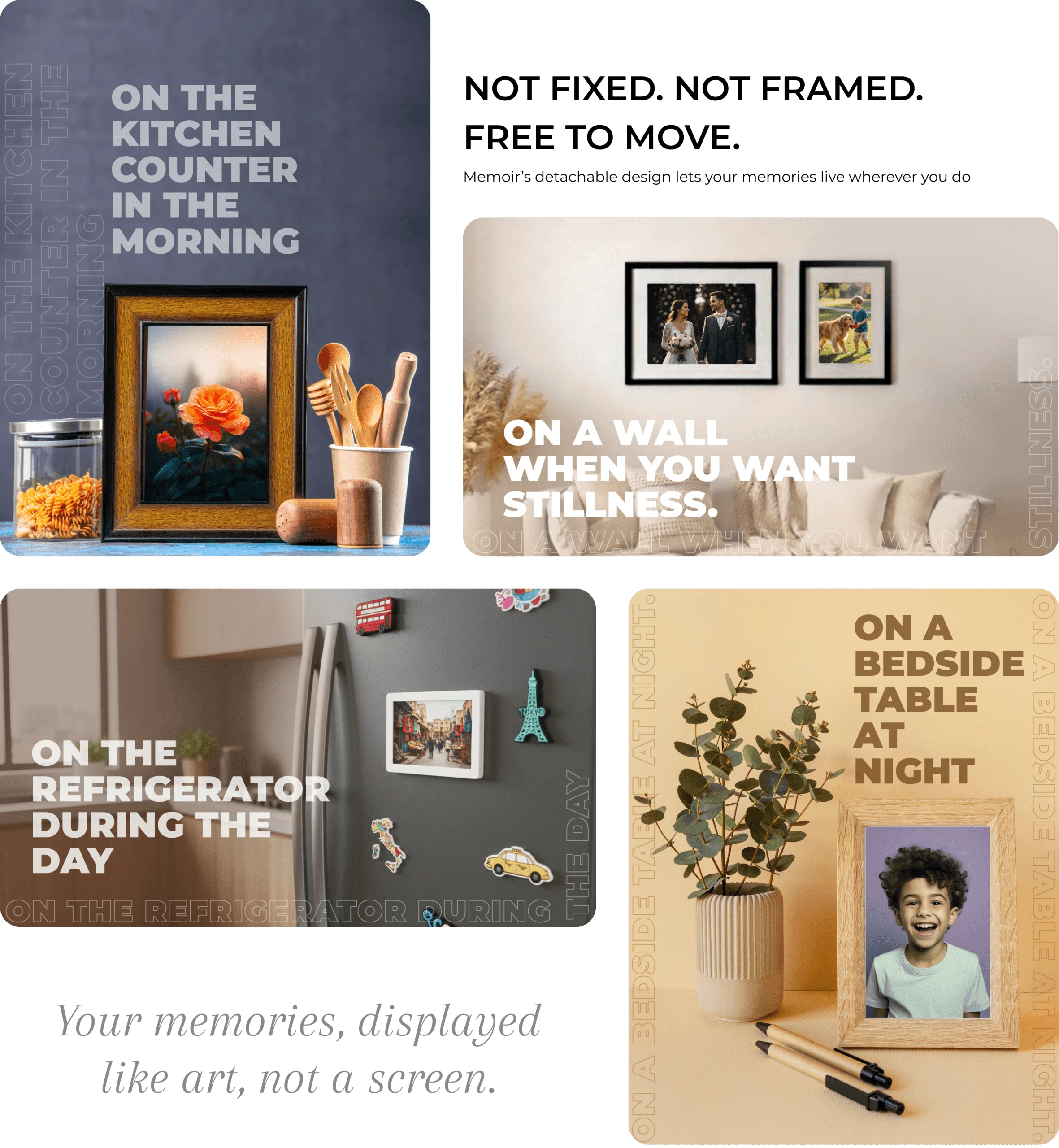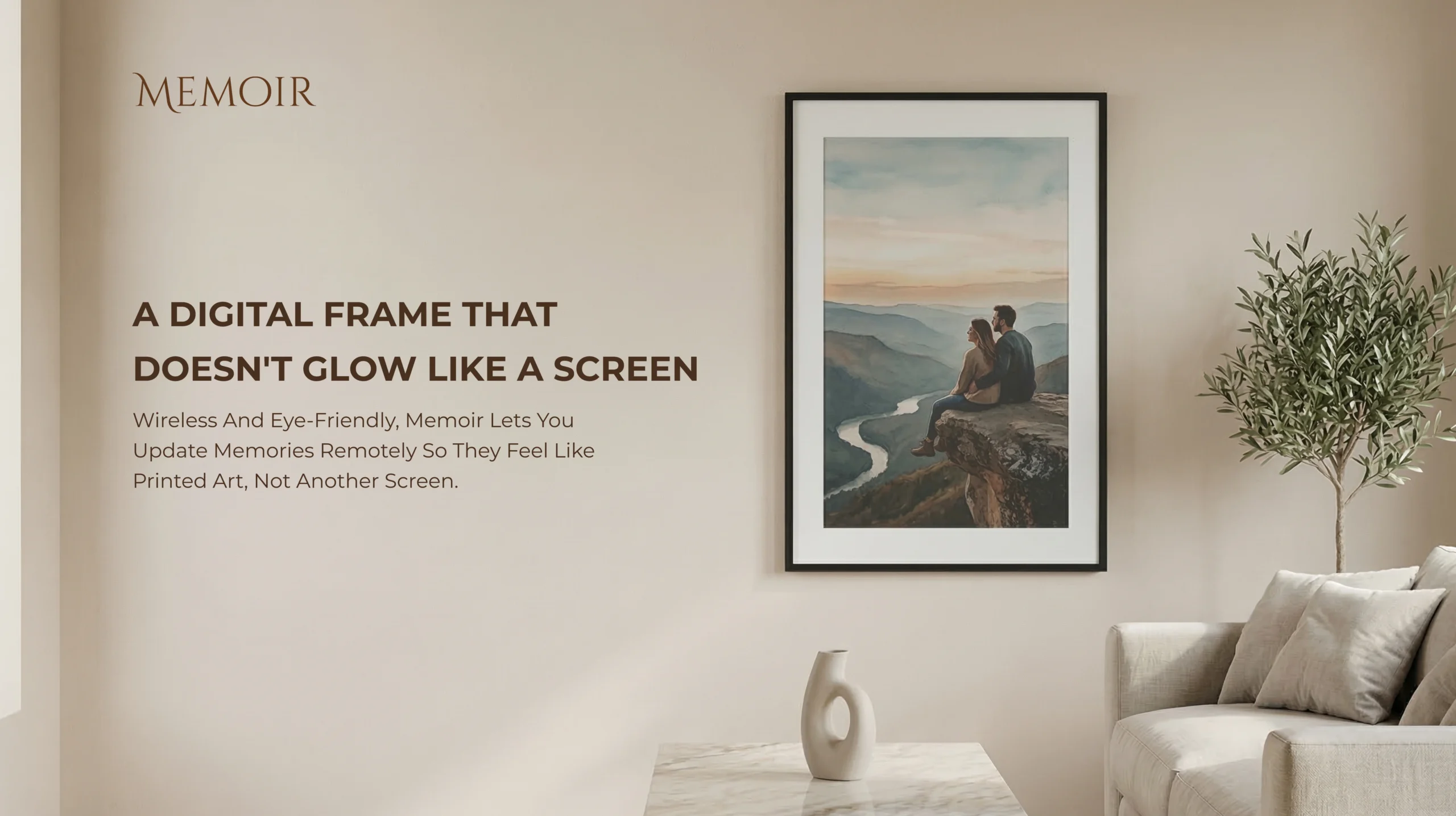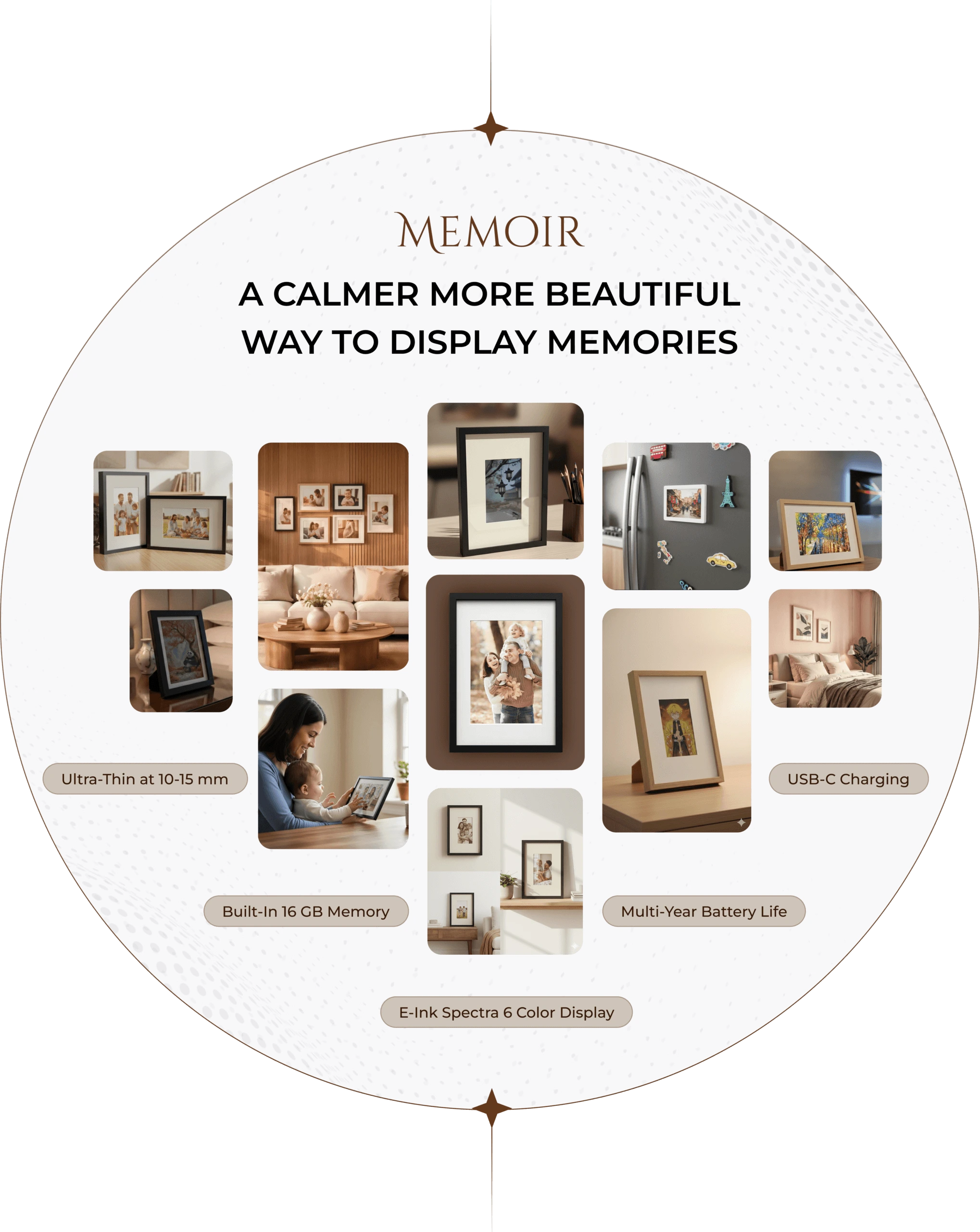 Neither. Memoir is a distraction-free E-Ink display designed only to show selected memories. It does not run apps, send notifications, or behave like a smart screen.
