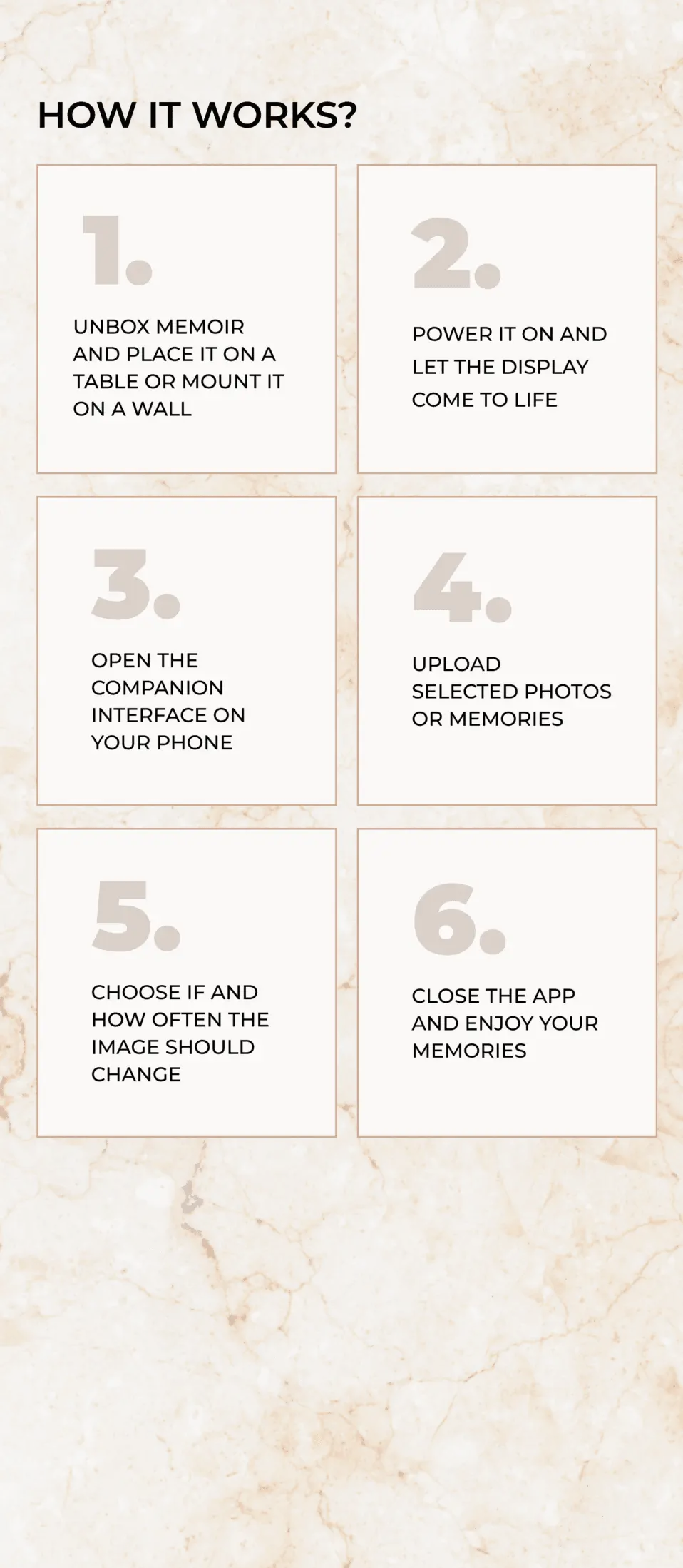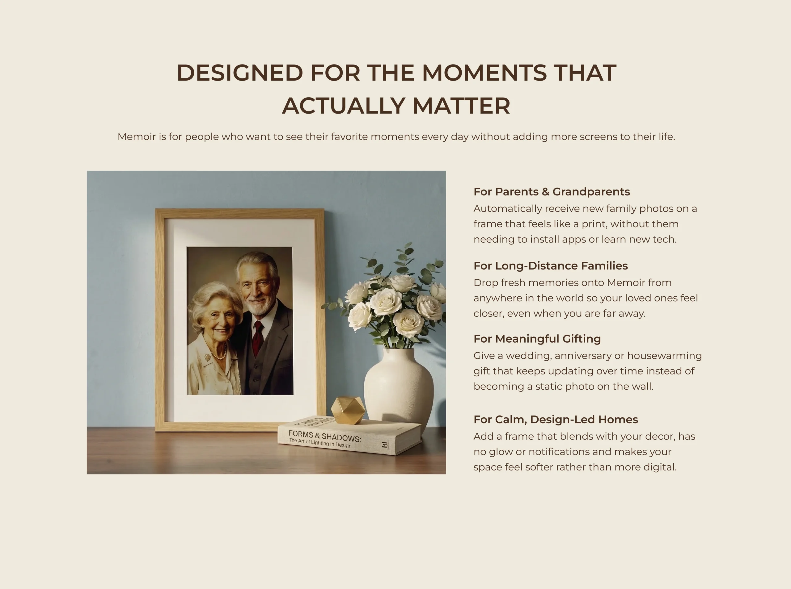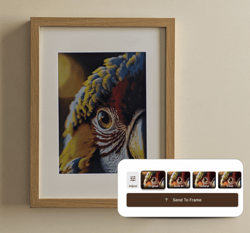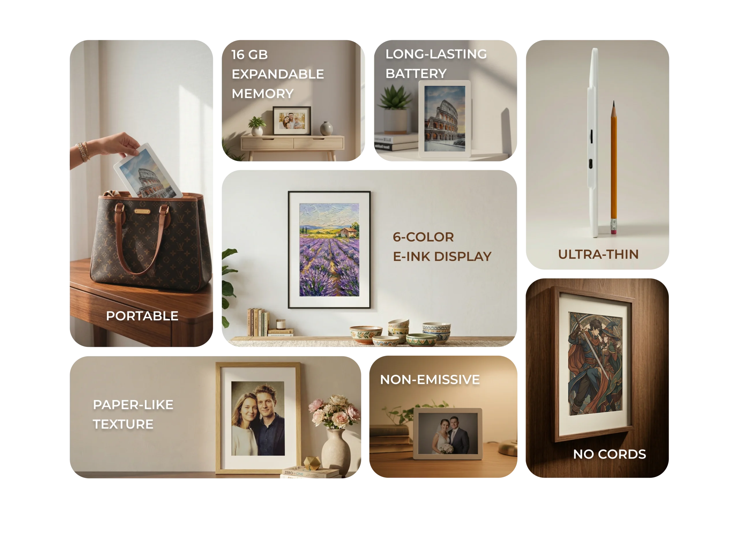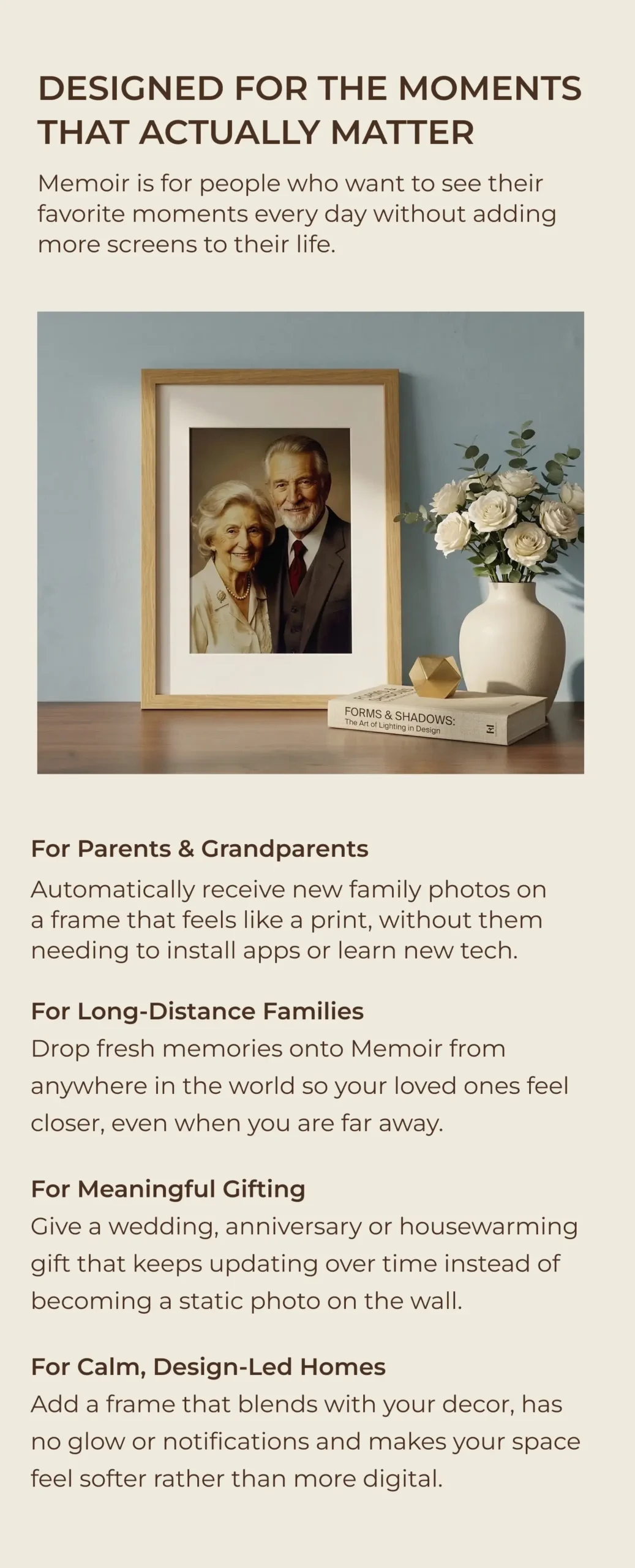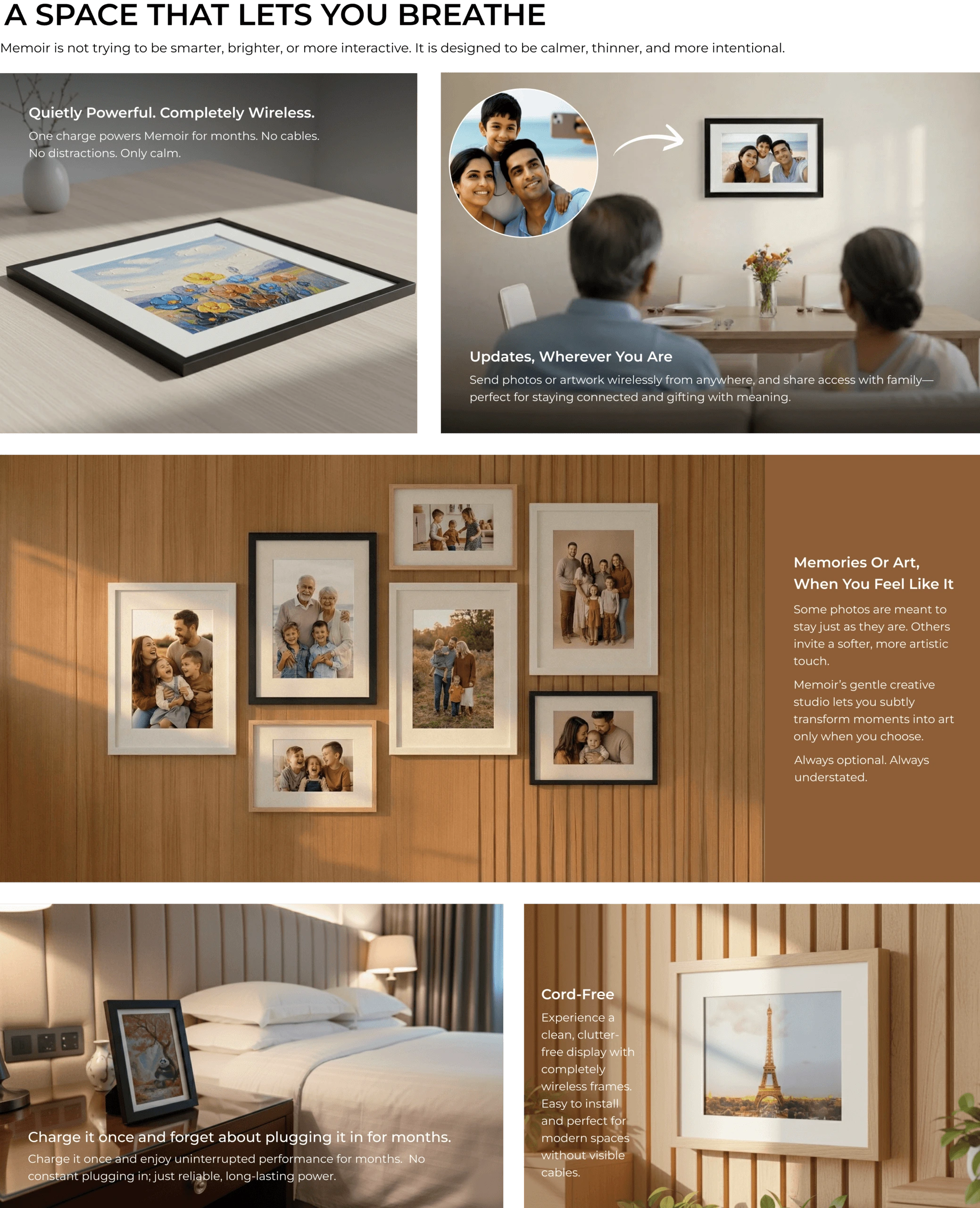 Neither. Memoir is a distraction-free E-Ink display designed only to show selected memories. It does not run apps, send notifications, or behave like a smart screen.